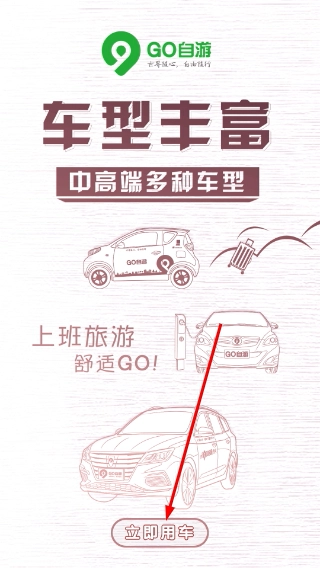 1、进入【GO自游】界面后,能看到平台提供的多种中高端车型,点击【立即用车】就能启动用车流程。