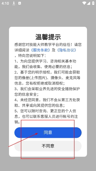 1、在使用【技能大师教学平台】之前,需要仔细阅读【服务条款】和【隐私协议】,在了解信息获取等相关提示后,点击【同意】按钮就能继续使用平台提供的服务。