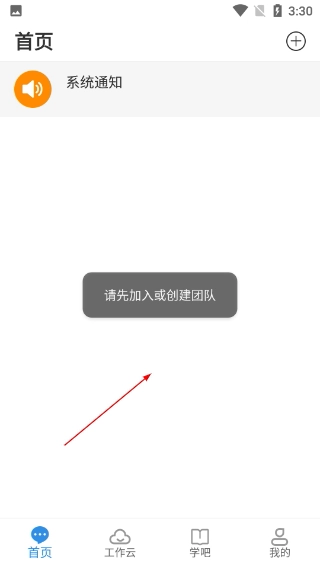 4、进入【首页】后,要先完成【加入或创建团队】的操作,才能使用相关功能,期间还能查看顶部的【系统通知】。