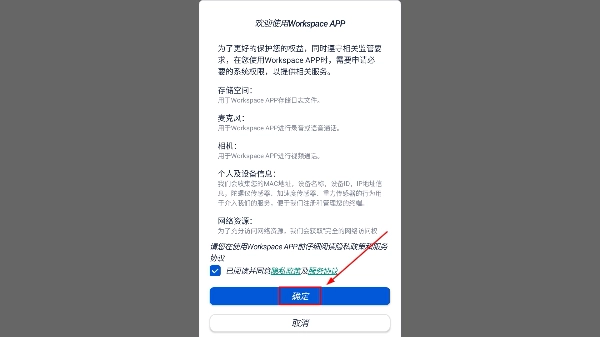 1、仔细阅读Workspaces-的服务说明,确认无误后勾选同意协议的选项,再点击【确定】按钮,即可完成初始授权操作。