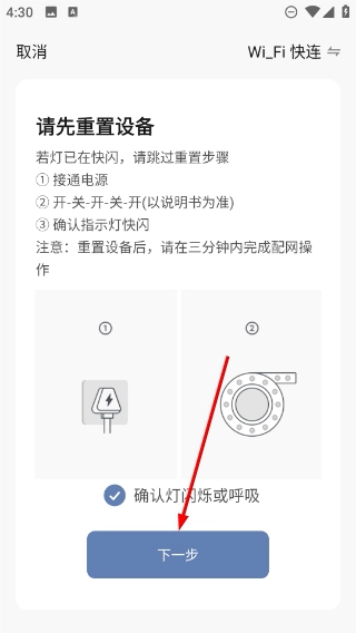 3、依据【请先重置设备】的步骤完成操作后,勾选【确认灯闪烁或呼吸】选项,再点击【下一步】按钮以继续流程。