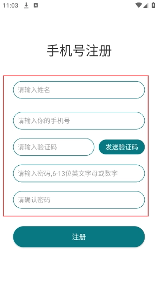 4、进入账号注册界面后,按照顺序填写【请输入姓名】【请输入你的账号】等相关信息,设置6到13位的密码,之后点击【注册】按钮即可完成注册操作。