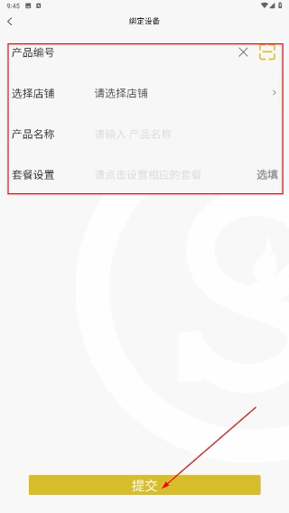 4、返回绑定设备页面,填写【产品编号】【产品名称】等相关信息,选择对应的店铺后点击【提交】按钮,即可完成绑定操作。