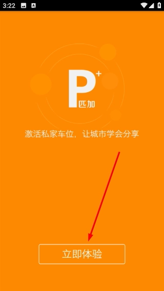1、在“匹加”应用的启动页面,点击“立即体验”按钮,即可进入应用主界面,此应用的核心功能是激活私家车车位的共享。