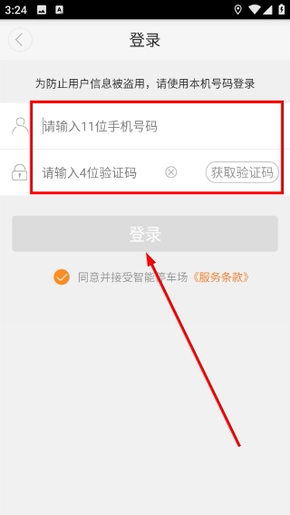 3、登录页面操作步骤如下:先输入11位号码,接着点击“获取验证码”,把收到的4位验证码填入相应输入框,勾选服务条款后,登录按钮便会激活。