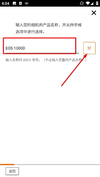3、进入相机型号输入页面后,填写对应的型号(例如【EOS-1300D】),接着点击【好】按钮,完成设备信息的确认。
