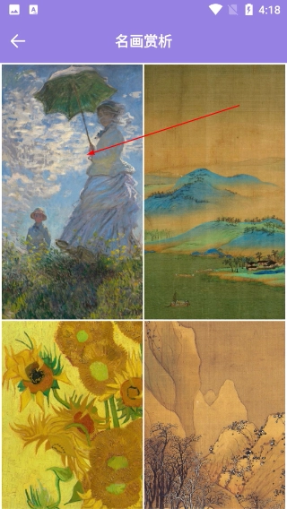 3、进入【名画赏析】页面,可浏览不同风格的经典画作(例如印象派、传统山水类作品),点击相应画作即可进入详情页查看具体细节。