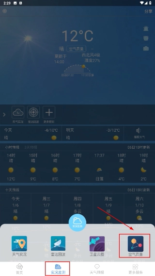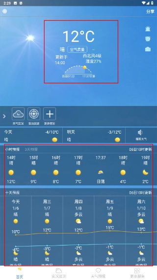 2、主界面可查看实时气温、空气质量等气象数据,同时能浏览小时、十天的天气预报信息。
