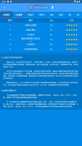 4、在空气质量页面中,点击“排优先”按钮可以调整排序方式,并且能够查看与空气质量相关的科普内容。