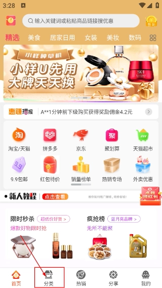 1、在首页点击【分类】按钮就能进入分类页面,首页还设有【淘天-天猫】等平台入口以及各类优惠活动,能帮助用户更便捷地快速找到目标内容。