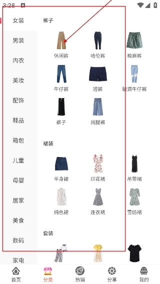 2、进入【分类】页面后,在左侧选择【男装】等品类,右侧可精准筛选【休闲裤】等具体商品类型,以此高效缩小搜索范围。