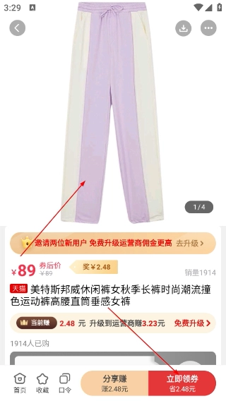 4、进入商品详情页面,查看【美特斯邦威休闲裤女-秋季长裤】的参数与价格,点击【立即领券】领取优惠后即可下单。