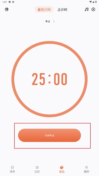 4、进入番茄钟界面后,点击“开始专注”按钮,即可启动时长为25分钟的专注计时功能。