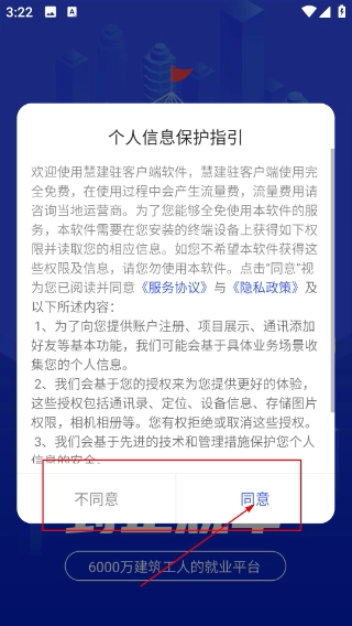 1、在使用【慧建驻客】之前,请阅读【个人信息保护指引】,以便了解信息收集、权限获取等相关内容,之后点击【同意】即可继续使用。