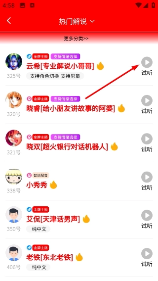 4、在热门解说的音色列表里,找到你想选的目标音色(比如云希),点击它对应的“试听”按钮,就能提前听到这个音色的配音效果。
