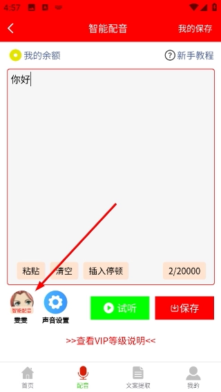 1、在配音平台首页,点击底部的“配音”选项,即可进入智能配音界面,进行配音内容的创作操作。