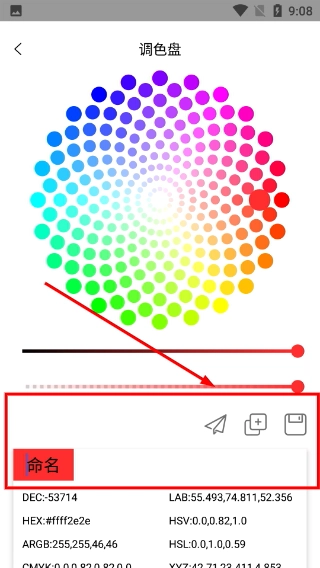 4、选好颜色后,界面会呈现该颜色的各类数值(像HEX、RGB),能在“命名”栏输入名称,以此完成颜色的标识和记录。