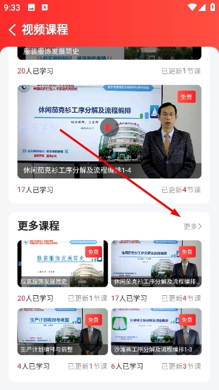 2、进入视频课程页面后,点击“更多”按钮,即可进入更多课程的列表界面,查看所有可供学习的课程内容。