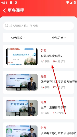 3、在更多课程列表里,找到你想学习的目标课程(例如《服装服饰发展简史》),点击对应的课程卡片,就能进入该课程的详情播放页面。
