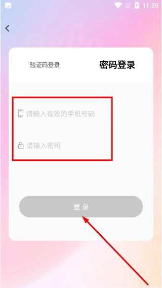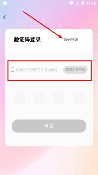 2、进入登录页面后,默认展示的是验证码登录界面,你可以在输入框中填写号码并获取验证码,以此完成登录;另外,也能点击“密码登录”来切换登录方式。