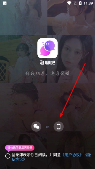 1、在“泡聊吧”应用的登录选择界面,点击图标,可进入账号登录的选择页面,切换登录方式。