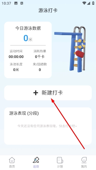 2、进入运动页面的游泳打卡板块,点击“新建打卡”按钮,即可打开新建游泳打卡的信息填写界面。