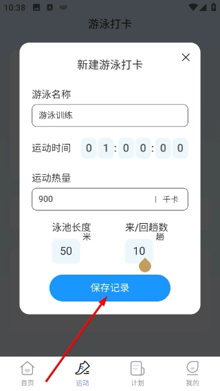 3、进入新建游泳打卡页面,依次填写游泳名称、运动时长、消耗热量等信息,点击“保存记录”按钮,就能完成本次游泳数据的打卡操作。