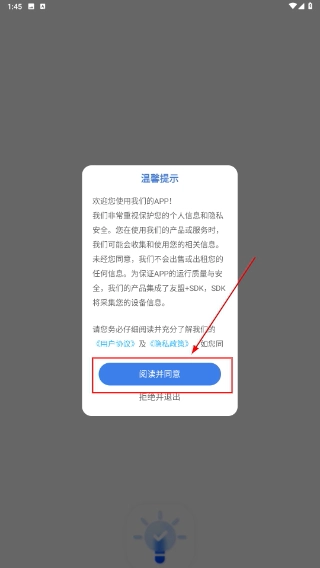 1、当【温馨提示】窗口弹出后,仔细阅读其中关于隐私的相关说明,随后点击【阅读并同意】按钮,完成协议确认,以便继续后续操作。
