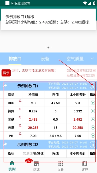 3、进入【环保监测预警】实时页面,查看【示例排放口1-2】的各项指标检测值与限值,了解其超标状况,页面底部设有功能导航栏。