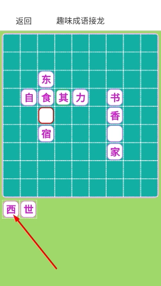 4、接着挑选底部还没选过的候选文字(比如“西”),填到网格的空白位置,一步一步地完成成语接龙的填空任务。