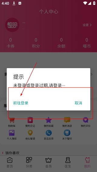3、进入个人中心后,若弹出“未登录或登录过期”的提示框,点击【前往登录】按钮,即可进入账号登录页面。