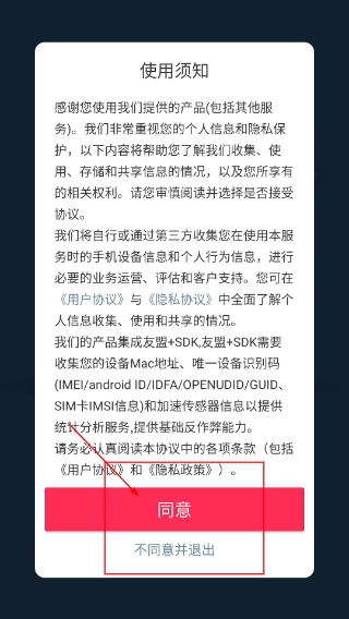 1、在进入应用之前,会展示使用须知,需要阅读《用户协议》《隐私政策》的相关内容,点击【同意】按钮后,就能进入应用主界面。