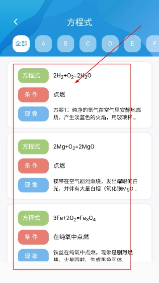 3、进入【方程式】页面,即可查看各类化学反应方程式,还能了解每个反应的条件、现象等相关信息。