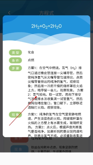 4、点击具体的化学方程式(例如\(2H_2+O_2=2H_2O\)),即可进入详情页面,查看该反应的类型、发生条件、操作步骤以及实验现象等详细信息。