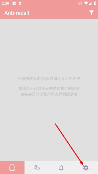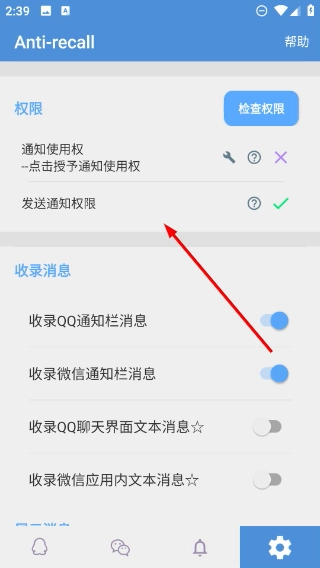 3、进入权限设置页面后,能够开启【发送通知权限】,同时对【收录QQ通知栏消息】【收录微信通知栏消息】等功能的开关进行配置。