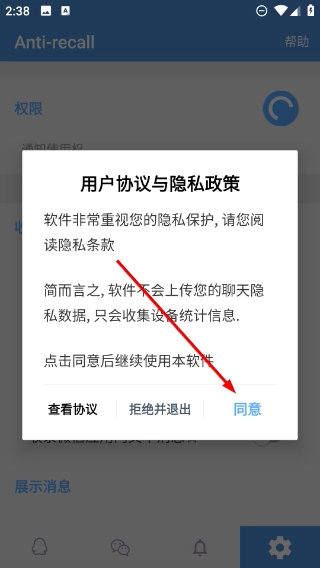 1、在【Anti-recall】的用户协议弹窗里,仔细阅读内容后点击【同意】按钮,就能确认相关协议并继续使用这款软件。