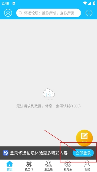 2、进入【怀远论坛】首页后,若遇到无法请求数据的情况,可点击【立即登录】按钮,进入论坛登录相关操作流程。