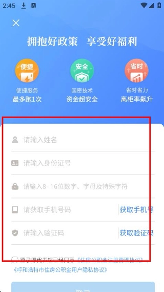 4、进入登录页面后,需填写【请输入姓名】、【请输入身份证号】等信息,勾选相关协议后即可完成登录流程。