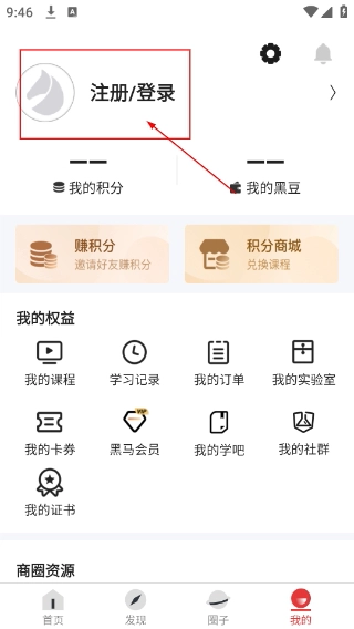 2、进入页面后点击【注册/登录】,完成操作后可使用【我的课程】-【学习记录】等个人权益相关功能。