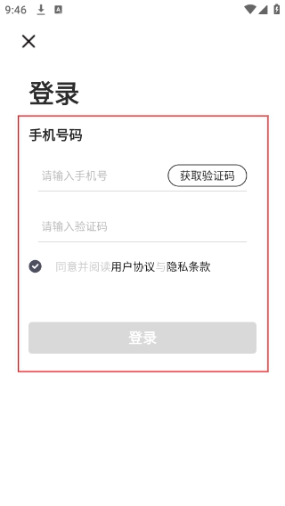 3、登录界面需先填写【号码】,点击【获取验证码】并输入验证码,勾选相关协议后即可完成登录操作。