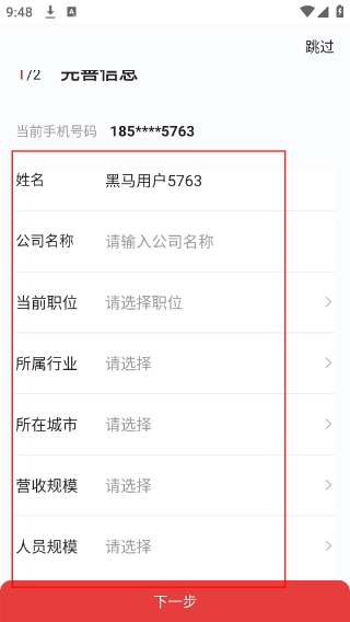 4、完善信息页需要补充【公司名称】-【当前职位】等信息,当前账号已显示相关内容,填写完毕后点击【下一步】即可完成信息完善。