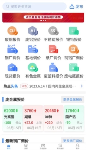 1、首先进入软件能看到各类金属报价,像废铜、废铝、废纸之类的,登录账号后就能查看了。