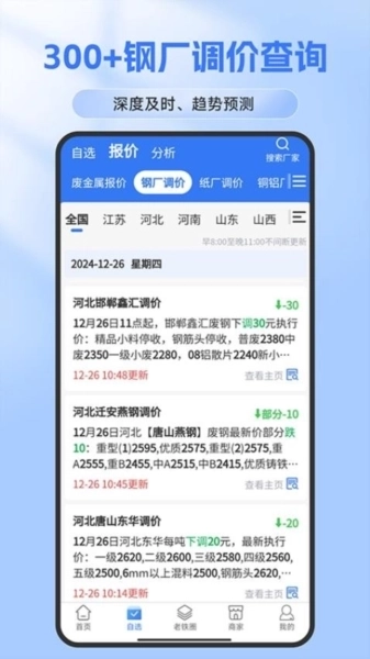 5、为行业回收商家提供入驻及营销推广支持,同时提供实时行情快讯、钢厂调价信息与市场热点关注等服务。