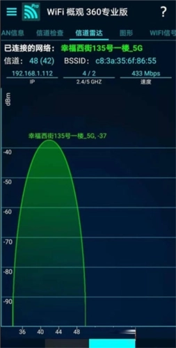 WiFi概观360专业版(WiFiOverview360Pro)是北京奇虎科技有限公司推出的一款手机WiFi检测工具。这款软件功能强大,能帮助用户快速完成检测,提供无线扫描、WLAN信息查询、信道检查、信道雷达、图形化展示、WiFi信号稳定性监测等实用功能,且支持一键操作,为用户带来极大便利,确保操作过程顺畅无忧。
