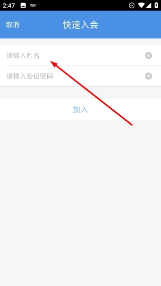 2、在快速入会页面,按顺序填写参会需要的姓名和会议密码,填好后点击【加入】按钮就能进入对应的会议。