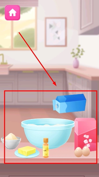 2、在厨房场景里,点击台面上的食材(像牛奶、面粉这类),把它们添加到容器中进行制作。