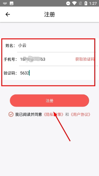 4、进入注册页面后,依次填写姓名与号码,获取并输入验证码,勾选相关协议,最后点击【注册】按钮,即可完成账号创建。