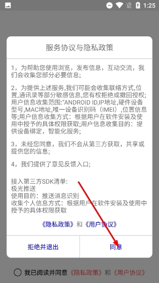 1、在【服务协议与隐私政策】弹窗里,仔细阅读相关条款内容后,点击【同意】按钮,这样就能继续使用应用的各项功能了。