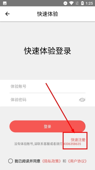 3、在快速体验登录页面,若不需要使用体验账号,点击【快速注册】按钮即可进入注册流程界面。