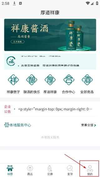 1、打开厚道祥康首页,点击底部的【我的】进入个人中心,在这里可以进行账号相关操作,还能看到【祥康酱酒】和【祥康数字】等功能的入口。